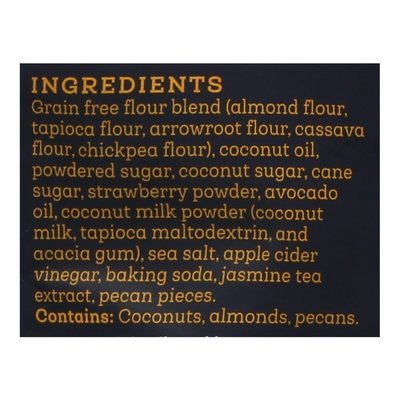 INGREDIENTS: Grain Free Flour Blend (Almond Flour, Tapioca Flour, Arrowroot Flour, Cassava Flour, Chickpea Flour), Coconut Oil, Powdered Sugar, Coconut Sugar, Cane Sugar, Strawberry Powder, Avocado Oil, Coconut Milk Powder (Coconut Milk, Tapioca Maltodextrin, and Acacia Gum), Sea Salt, Apple Cider Vinegar, Baking Soda, Jasmine Tea Extract, Pecan Pieces.