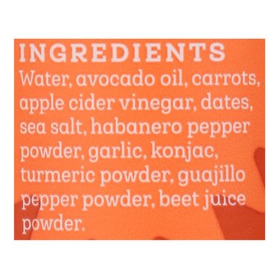 INGREDIENTS: Ingredients Water, Avocado Oil, Carrots, Apple Cider Vinegar, Dates, Sea Salt, Habanero Pepper Powder, Garlic, Konjac, Turmeric Powder, Guajillo Pepper Powder, Beet Juice Powder.