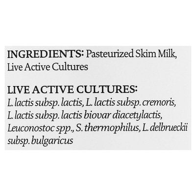 INGREDIENTS: Pasteurized Skim Milk, Live Active Cultures, Live Active Cultures: L. Lactis Subsp. Lactis, L. Lactis.Cremoris, L. Lactis Subsp. Lactis Biovar Diacetylactis, Leuconostoc Spp, S. Thermophilus, L. Delbrueckii subsp. Bulgaricus.