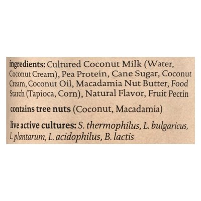 INGREDIENTS: Coconut Milk (Water, Coconut Cream), Pea Protein, Cane Sugar, Coconut Cream, Coconut Oil, Macadamia Nuts, Tapioca Flour, Natural Flavor, Fruit Pectin, Live Cultures. Live Active Cultures: S. Thermophilus, L. Delbrueckii subsp. Bulgaricus, L. Plantarum, L. Acidophilus, B. Lactis.