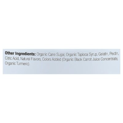 INGREDIENTS: Other Ingredients: Organic Cane Sugar, Organic Tapioca Syrup, Gelatin, Pectin, Citric Acid, Natural Flavors (Orange, Lemon, Strawberry Banana) and Natural Colors Added (Annatto, Organic Turmeric, Organic Black Carrot Juice Concentrate).