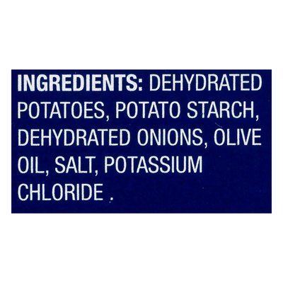 INGREDIENTS: Dehydrated Potatoes, Potato Starch, Dehydrated Onions, Olive Oil, Salt, Potassium, Chloride.