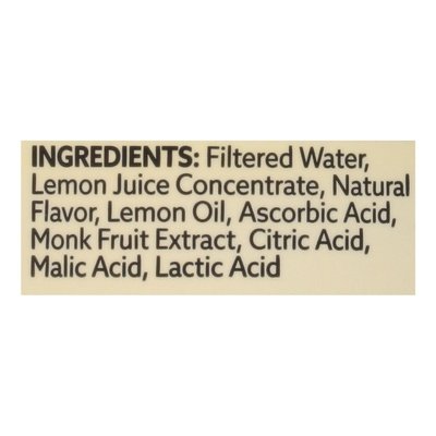 INGREDIENTS: Filtered Water, Lemon Juice Concentrate, Natural Flavor, Lemon Oil, Ascorbic Acid, Monk Fruit Extract, Citric Acid, Malic Acid, Lactic Acid.