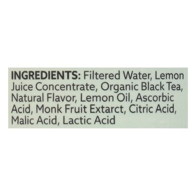 DESCRIPTION: Sweet from monk fruit. 5 calories. 0 g sugar. Zero sugar. Gluten free. Vegan. 100% daily vitamin C. Contains 24 mg caffeine. Non-GMO Project verified. nongmoproject.org. For us, it's personal. Our co-founder Jen is a Type 1 diabetic, so we created Swoon with a mission to make zero sugar drinks that actually taste good. Nothing artificial. Not too sweet. FWIW, a cup of coffee has 90 mg of caffeine. Drink Swoon not sugar. tasteswoon.com. Instagram (at)swoon. TikTok (at)tasteswoon. Please recycle. < Filtered Water, Lemon Juice Concentrate, Organic Black Tea, Natural Flavor, Lemon Oil, Ascorbic Acid, Monk Fruit Extract, Citric Acid, Malic Acid, Lactic Acid.