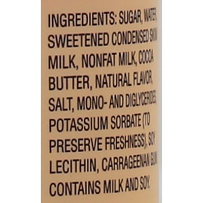 INGREDIENTS: Sugar, Water, Sweetened Condensed Skim Milk (Skim Milk, Sugar), Tapioca Syrup, Nonfat Milk, Cocoa Butter, Less than 1% of Natural Flavors, Salt, Carrageenan Gum, Canola Lecithin.