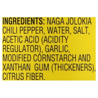 INGREDIENTS: Naga Jolokia Chili Pepper, Water, Salt, Acetic Acid (Acidity Regulator), Garlic, Modified Cornstarch and Xanthan Gum (Thickeners), Citrus Fiber.