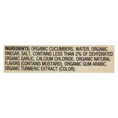 INGREDIENTS: Organic Cucumbers, Water, Organic Vinegar, Salt, Contains Less than 2% of Dehydrated Organic Garlic, Calcium Chloride, Organic Natural Flavors (Contains Mustard), Organic Gum Arabic, Organic Turmeric Extract (Color).