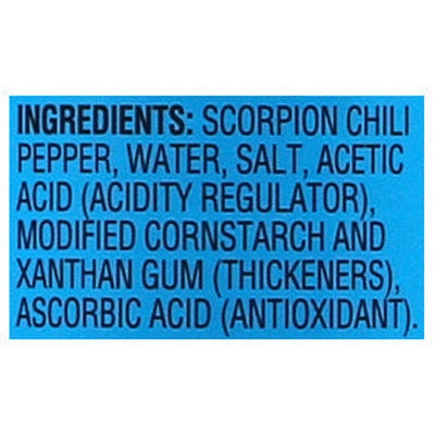 INGREDIENTS: Scorpion Chili Pepper, Water Salt, Acetic Acid (Acidity Regulator), Modified Cornstarch and Xanthan Gum (Thickeners), Ascorbic Acid (Antioxidant).
