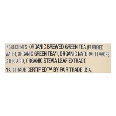 INGREDIENTS: Organic Brewed Green Tea (Purified Water, Organic Green Tea (Fair Trade Certified by Fair Trade USA. Over 65% Fair Trade Certified Ingredients)), Organic Natural Flavors, Citric Acid, Organic Stevia Leaf Extract.